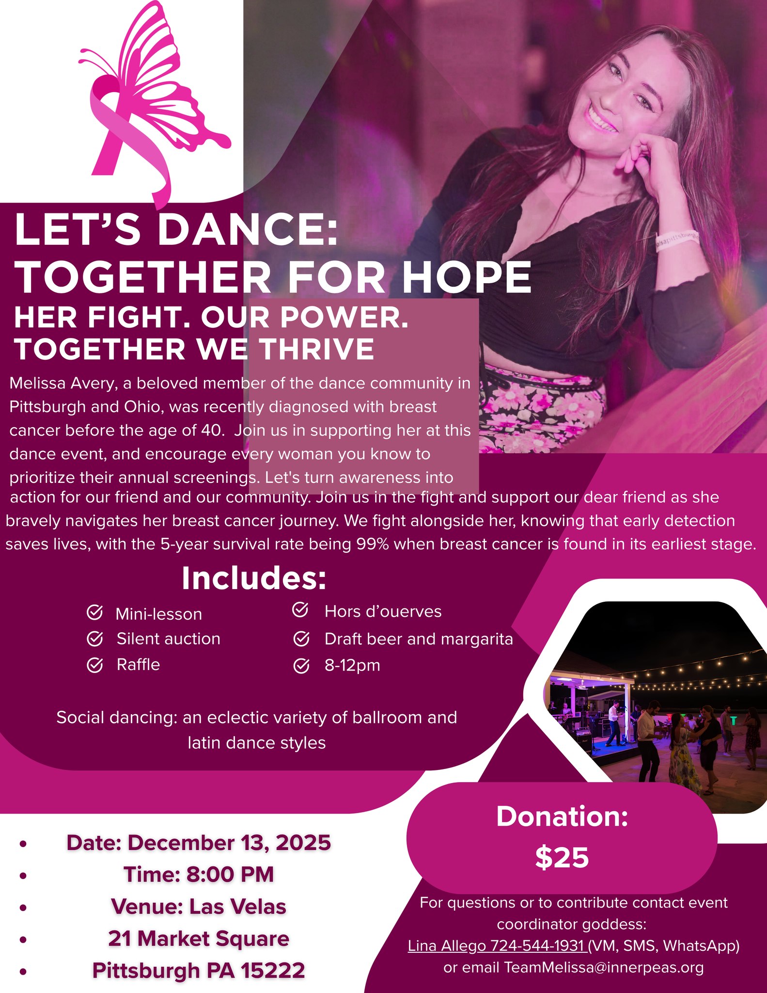 DANCE FRIENDS is pleased to help support LET’S DANCE: TOGETHER FOR HOPE, a fundraiser for Melissa Avery, a vibrant young dancer, well-known in the Latin dance community, who was recently diagnosed with breast cancer. A group of her dance friends are organizing a spectacular evening of music and dance to help raise money for her medical expenses and to raise awareness about cancer risk for young women. This event will feature music for an eclectic variety of social dance styles.
